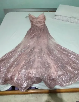 Elegante vestido de fiesta largo con detalles de pedrería. - Tirantes finos. - Cuerpo drapeado. - Adorno de pedrería en la cintura. - Falda con vuelo y caída asimétrica con cola precio negociable