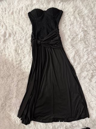 Elegante vestido negro de fiesta con detalles de pedrería. La falda tiene una abertura en la parte de atrás. - Marca: FAYAZI - Diseño: EVENINGS PARIS Medidas: - Contorno pecho: 0,92cm. - Cintura: 0,82cm. - Cadera: 106cm