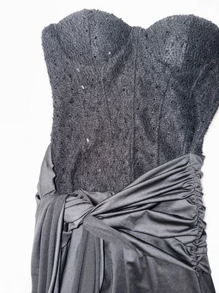 Elegante vestido de fiesta largo. - Diseño sin tirantes. - Cuerpo drapeado. - Falda con caída. - Cremallera lateral oculta.