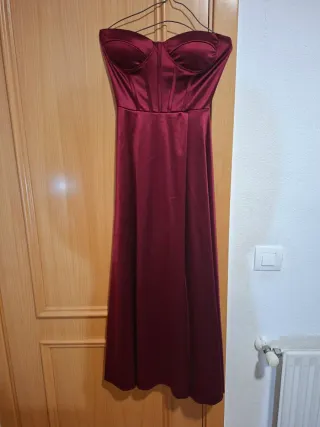 Elegante vestido largo de fiesta en color rojo. Ideal para eventos especiales. - Diseño sin tirantes con escote corazón. - Tejido satinado con detalles de corsé en el torso. - Falda larga con caída. - Cremallera lateral oculta.