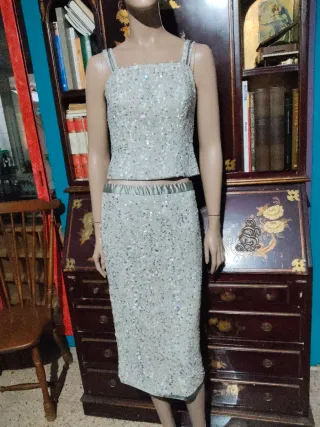 Elegante conjunto de top y falda adornado con lentejuelas. - Alta Creación de la Modista, Teresa Ripoll. - 100% Seda. - Forrado. - VINTAGE. - Tiene arreglos en los tirantes. - Diseño de tirantes finos en el top. - Falda de corte recto. - Cintura elástica en la falda.