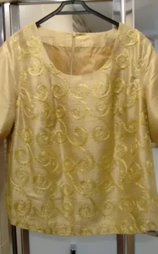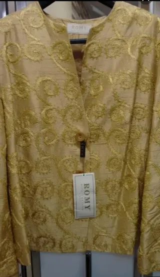 Tres piezas Marca Romy ( Alta costura) Elegante traje chaqueta con top manga corta, falda y chaqueta manga larga de fiesta con un diseño bordado. Seda seda salvaje, con brocado Impecable puesto solo dos horas Precio original en tienda 357 € - Color dorado, oro viejo - Diseño con bordados. - Cierre de botón.