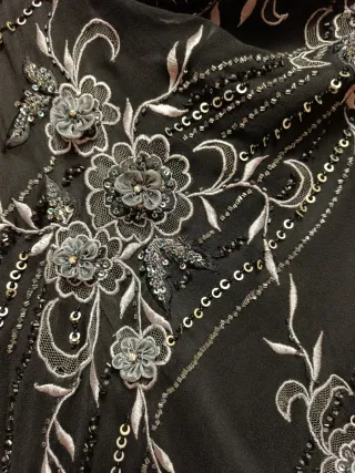 Elegante vestido largo, ideal para invitadas a bodas o eventos especiales. Su diseño combina detalles brillantes con una falda vaporosa. - Escote en V pronunciado. - Cuerpo adornado con pedrería y apliques florales. - Cinturón fino a juego. - Falda larga de tul con bordados. TOTALMENTE NUEVO SIN ESTRENAR