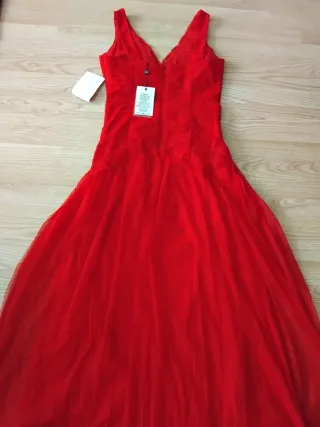 Elegante vestido largo de fiesta en color rojo. Ideal para eventos especiales Cremallera por detras,forjado.Tallas S-L - Diseño con escote en V. - Falda larga y fluida. - Tejido de tul.