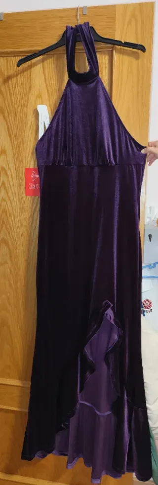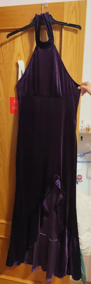 Elegante vestido largo de fiesta con un tacto suave de terciopelo. - Diseño con cuello halter. - Detalle de volantes en la falda. - Corte que estiliza la figura. - No se la talla exacta pero yo llevo una 42 y me queda perfecto