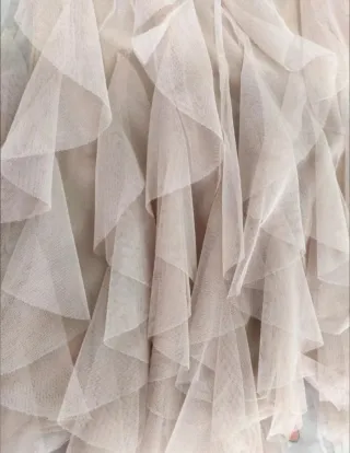 Vestido de fiesta elegante, con un diseño de volantes en cascada que le da mucho movimiento. Es una prenda que ha sido usada muy pocas veces y se encuentra en excelente estado. - Cuerpo drapeado. - Falda con múltiples capas de tul. - Cremallera lateral oculta.