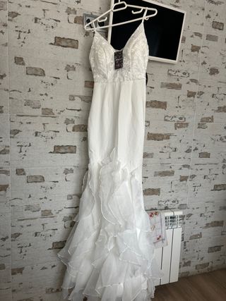 Vestido de fiesta o novia, nuevo sin estrenar. Un diseño elegante y sofisticado. - Cuerpo con detalles de pedrería. - Falda con volantes. - Tirantes finos.