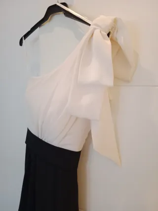 Elegante vestido de fiesta con un diseño bicolor. - Cuerpo superior blanco con detalle de lazo.(La parte superior delantera es guateada) - Cintura marcada en negro. - Falda larga negra.