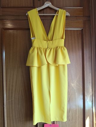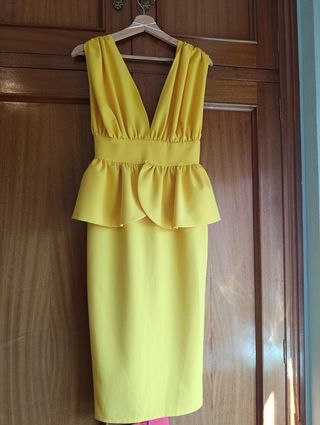 Elegante vestido de fiesta en color amarillo vibrante. Diseñado para destacar en cualquier ocasión especial. - Escote pronunciado en V. - Cintura marcada con detalle de peplum. - Falda recta hasta la rodilla con abertura trasera.