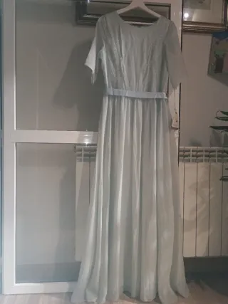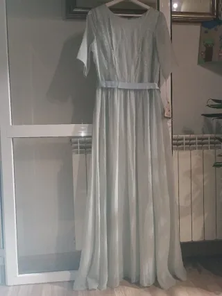 Elegante vestido de fiesta, utilizado únicamente en una ocasión. Se incluye un regalo de complementos. - Diseño con cuerpo bordado y falda larga. - Detalle de lazo en la cintura. - Se regalan los siguientes complementos: bolso, pendientes, fular y tocado. - El vestido mide 150cm de largo.