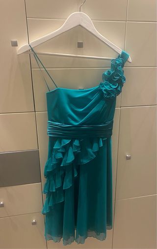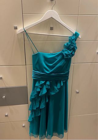 Elegante vestido de fiesta con un diseño asimétrico y detalles de volantes. - Escote asimétrico con detalle floral. - Cintura marcada con fruncido. - Falda con cascada de volantes. - Tirante fino.