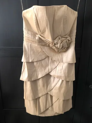 Elegante vestido de fiesta sin tirantes en color beige. Presenta un detalle de flor en la cintura y una falda con capas. - Diseño sin tirantes. - Detalle de flor. - Falda con capas.
