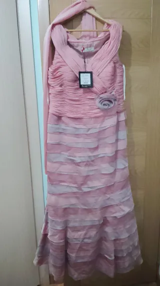 Elegante vestido de fiesta sin estrenar, con su etiqueta original. - Diseño con drapeados en el cuerpo. - Adorno floral en la cintura. - Falda con volantes en cascada. - Incluye chal a juego.