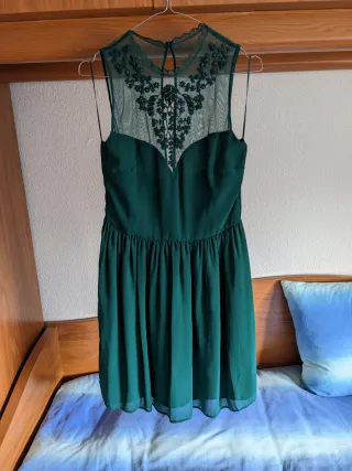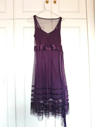 Elegante vestido de fiesta con detalles de pedrería y un delicado tejido de gasa. - Diseño con cinturón de satén. - Falda con capas de tul y adornos. - Escote en V con transparencia. -Queda espectacular -Precio original 199€