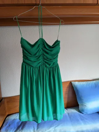 Vestido de fiesta con un llamativo acabado metalizado. Su diseño es elegante y moderno. - Escote pronunciado en V. - Mangas largas acampanadas y abiertas. - Detalle fruncido en la falda. Espalda al aire. Vale para tallas 34/36/38 Sólo puesto en una ocasión.
