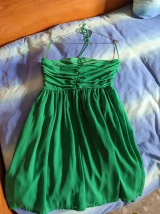 Vestido de fiesta con un diseño elegante y favorecedor. - Tirantes finos, atados al cuello - Cuerpo fruncido. - Falda con vuelo.