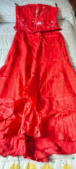 Elegante conjunto de dos piezas en color rojo, ideal para eventos especiales. La parte superior es tipo corsé con un diseño floral bordado y la falda tiene un cordón ajustable en la cintura. - Diseño de dos piezas. - Parte superior tipo corsé. - Falda con cordón. - Tejido satinado con estampado floral.