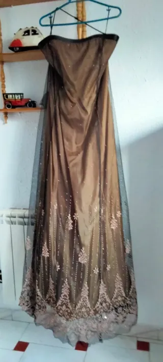 Elegante vestido de fiesta con un diseño llamativo. Está forrado el vestido. Lleva cremallera en la parte de atrás. - Cuerpo superior con lentejuelas doradas. - Falda de terciopelo negro. - Tirantes finos. LAS MANGAS ESTÁN UN POCO DETERIORADAS... SE PUEDE CORTAR PARA QUITARLO DETERIORADO . TAMBIÉN QUEDARÍA UNA CHAQUETA ELEGANTE CON MANGA CORTA... AL ESTAR DETERIORADA LAS MANGAS POR ESO TIENE ESTE PRECIO.