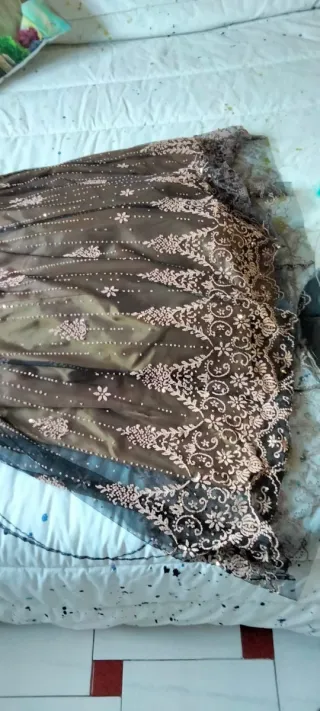Falda elegante con detalles bordados en negro. - Diseño con cintas y apliques de lentejuelas. - Bajo con tul. Forrada. - Ideal para eventos especiales.