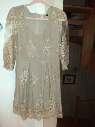 Elegante vestido de fiesta con detalles de encaje en tono dorado y beige. Ideal para ocasiones especiales. - Manga larga de encaje. - Diseño con falda plisada. - Cierre de cremallera en la espalda.