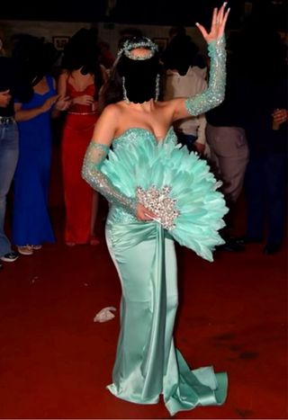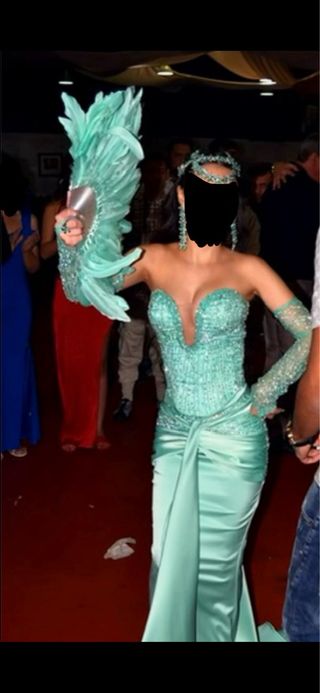 Vestido de fiesta largo dorado y verde agua