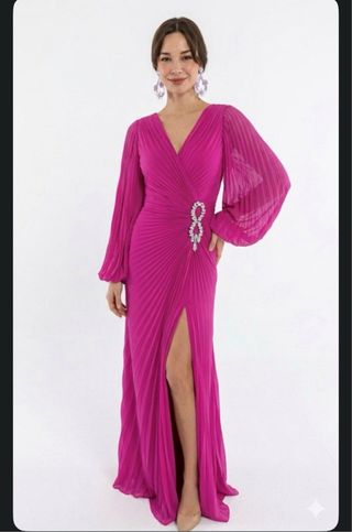 Vestido de gala elegante, ideal para bodas o eventos especiales. Su diseño moderno y favorecedor te hará destacar. - Mangas largas acampanadas con plisado. - Escote en V cruzado. - Detalle de pedrería en la cintura. - Falda larga con abertura lateral. - Color buganvilla -Tengo factura de compra. - Entrego en mano.
