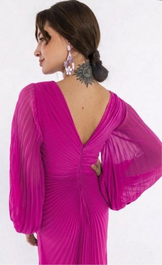 Vestido de fiesta de Sfera Collection, ideal para eventos especiales. Largo hasta tobillo Su diseño elegante y el color rosa fucsia lo hacen destacar. - Escote en pico con detalle. Espalda con una elegante apertura que deja la espalda parcialmente descubierta. - Mangas largas tres cuartos. Con una parte fruncida - Muy cómodo de llevar No necesita plancha - Fruncido en la cintura y mangas. - Abertura en la falda y en la espalda - Puesto 3 veces