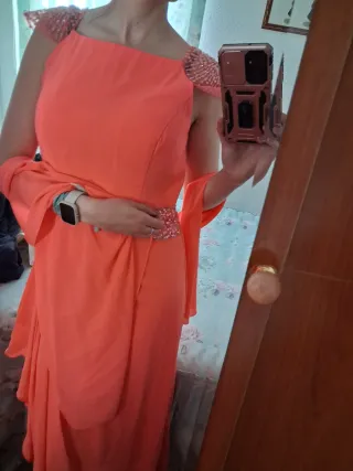 Elegante vestido largo en color coral, ideal para eventos especiales como bodas o fiestas en talla 42. - Diseño con detalles brillantes en mangas y cintura. - Falda con drapeado y volantes. - Tejido vaporoso y ligero. En perfectas condiciones ya que tiene una sola puesta y solamente realizo envíos.