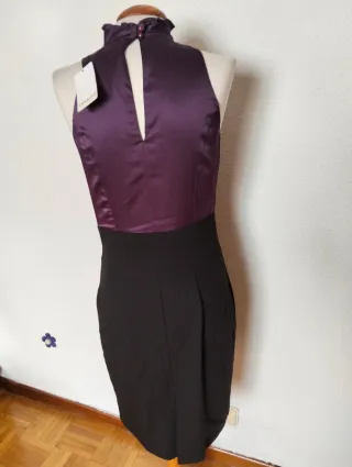 Vestido fiesta halter satén morado y negro
