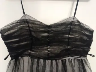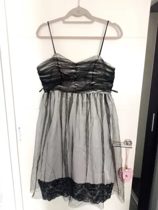 Vestido de fiesta con un diseño elegante y moderno. - Cuerpo superior con detalles drapeados. - Falda de tul con encaje en el bajo. - Tirantes finos ajustables. Aunque es talla 44 no da mucha talla sería más 42