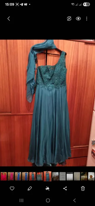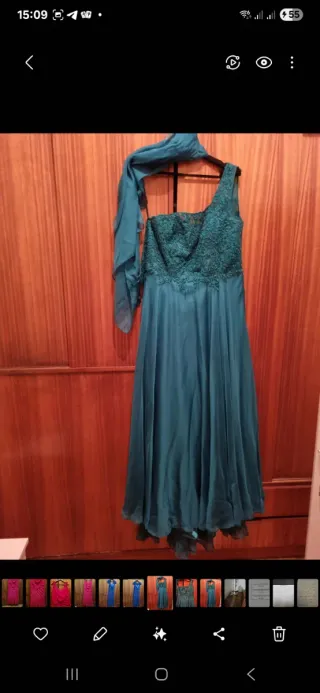 Vestido de fiesta verde azulado con chal