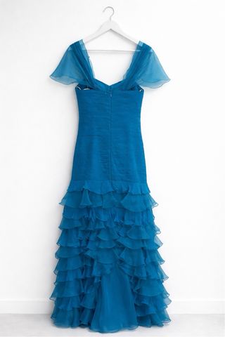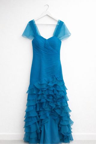 Elegante vestido de fiesta largo Sonia Peña en color azul, talla 42. El vestido tiene un cuerpo estructurado con ballenas, que sujeta muy bien el torso y estiliza la figura. La falda está compuesta por capas de volantes de gasa, que le dan mucho movimiento y un efecto muy elegante al caminar. Los tirantes de gasa que se ven en las fotos no son originales del vestido: se añadieron utilizando un chal para hacerlo más elegante en la zona del escote, pero se pueden descoser fácilmente si se prefiere llevarlo palabra de honor. Perfecto para bodas, eventos, graduaciones o fiestas. Vestido de gran calidad de la firma Sonia Peña. 🌸
