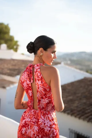 Elegante vestido largo con un estampado vibrante y llamativo. Perfecto para eventos especiales. - Diseño con escote halter. - Abertura frontal en la falda. - Estampado floral en tonos naranja y rosa.