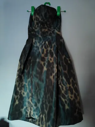 Precioso vestido de fiesta con un llamativo estampado. Talla 40, pero corresponde a M. - Diseño con y sin tirantes. - Falda con vuelo y pliegues. - Tejido satinado con brillo. - Forrado.
