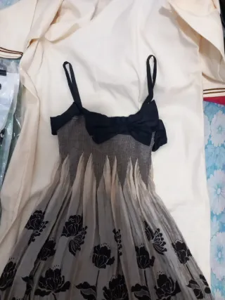 Vestido de celebración con un llamativo estampado inspirado en motivos orientales. - Diseño de tirantes halter. - Falda con vuelo. - Tejido satinado. - Color negro, gris y plateado. Usado una vez solo. Precio real 90€.