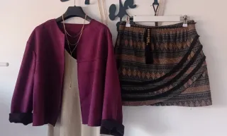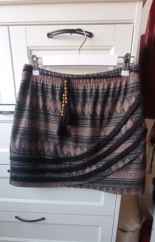 Es una prenda diferente. Vistosa, para salir una noche o de fiesta (en mi opinión, claro!) Buena marca, es ropa de calidad. Queda ligeramente por encima de la rodilla (largo total 40-41 cm), cadera 100-102 cm, cintura 72-100 cm (sin estirar y estirada). Es una talla L, pero en mi opinión talla justita. Composición 50% poliéster, 25% mohair y 5% elastano. Tiene forro, cintura elástica y cordón acabado en borlones. Colores negro, marrón y dorado, con ribetes en negro.