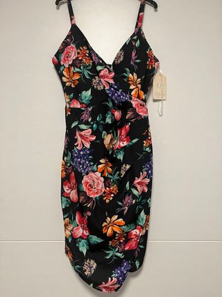 Vestido de fiesta con un vibrante estampado floral sobre fondo negro. Ideal para eventos especiales. - Diseño cruzado en el escote. - Falda con drapeado. - Tirantes finos.
