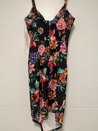Vestido de fiesta con un vibrante estampado floral. - Diseño sin mangas. - Cintura marcada. - Falda con vuelo. Talla como una M