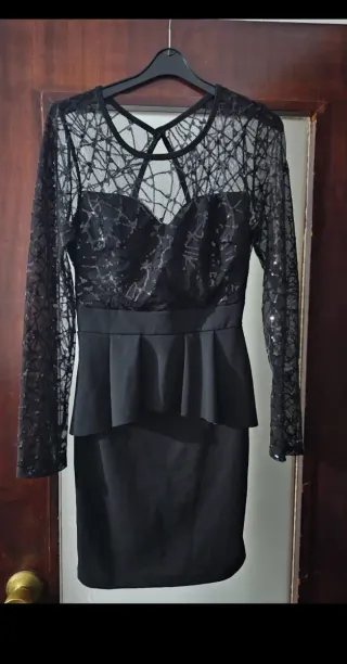 Elegante vestido de fiesta con manga larga y detalles de lentejuelas. - Diseño con escote ilusión y peplum. - Tejido principal opaco en falda y cuerpo. - Mangas transparentes con estampado de red y lentejuelas.