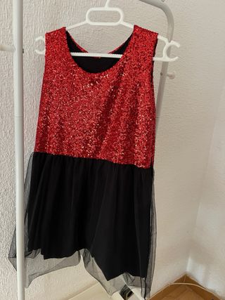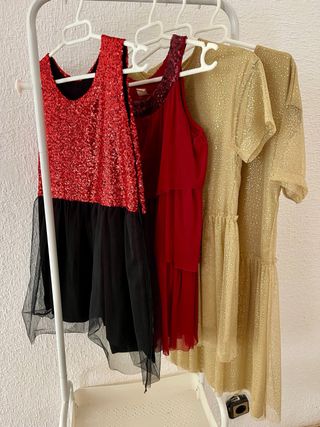 Conjunto de cuatro vestidos para niña, ideales para fiestas. - Vestido rojo con lentejuelas y falda de tul negro. - Vestido rojo con volantes y detalles brillantes. - Vestido dorado con estampado de purpurina.