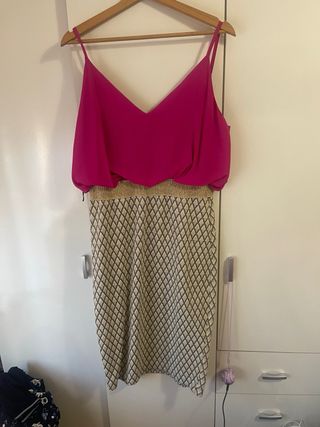 Elegante vestido de fiesta con un diseño único. - Cuerpo superior en color fucsia con tirantes finos. - Cintura adornada con detalles dorados. - Falda con estampado geométrico en tonos dorados y beige.