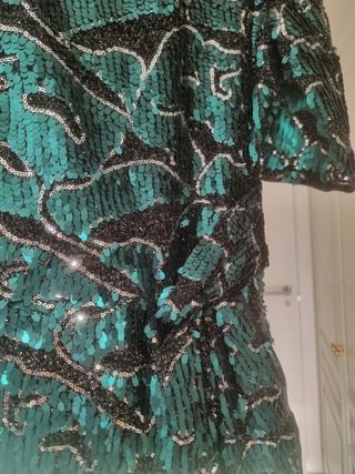 Vestido de fiesta con un llamativo estampado de lentejuelas. - Diseño con cuello alto. - Manga cortaal encima codo - Cierre de cremallera en la espalda. Con un atado a la cintura de l que sale la falda. Ver fotos Solo se ha usado en una fiesta