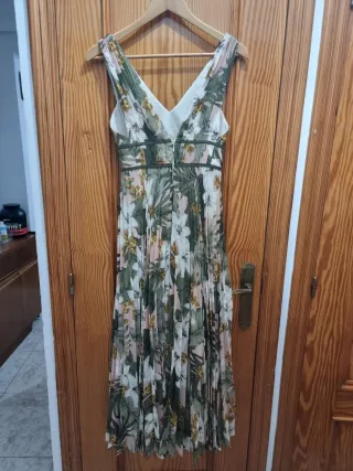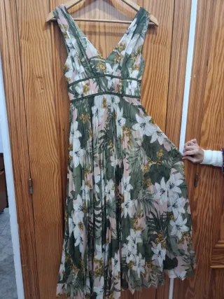 Vestido de fiesta con un solo uso, ideal para eventos especiales. Presenta un estampado floral vibrante y un diseño plisado. - Diseño de tirantes. - Escote en V. - Cintura marcada. - Falda larga plisada.