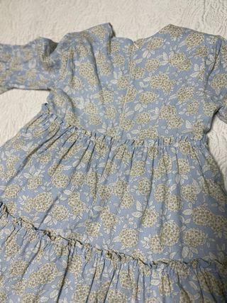 Vestido de fiesta para niña de Tutto Piccolo. Precioso estampado floral en tonos azules y beige, con un detalle de lazo en la cintura. Talla 12. - Diseño de dos volantes en la falda. - Mangas cortas con volantes. - Cierre en la espalda.