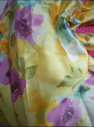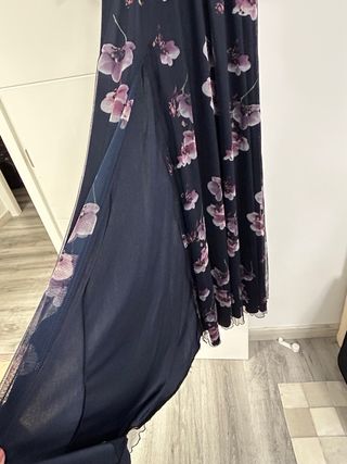 Elegante vestido de fiesta con un llamativo estampado floral. - Diseño con volantes en los hombros. - Cintura marcada con fajín. - Falda larga y con vuelo. - Bolsillos laterales. Es la talla 40 pero está un poco arreglado para ajustarlo. Se ha usado solo una vez.