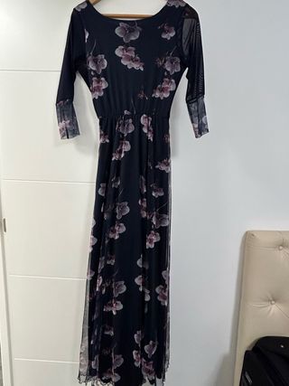 Elegante vestido largo con estampado floral, ideal para eventos especiales. - Diseño con mangas largas de malla. - Cintura elástica para un mejor ajuste. - Falda larga con vuelo.