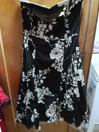 Elegante vestido largo con estampado floral. Perfecto para eventos especiales. Talla 46 - Diseño de dos piezas: cuerpo negro y falda estampada. - Detalle floral en el hombro.