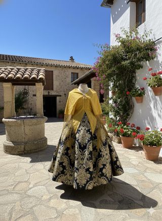 Traje tradicional de baturra, ideal para fiestas y eventos. - Falda larga con estampado floral. Azul marino y dorado largo 96 cmy de cintura 115
