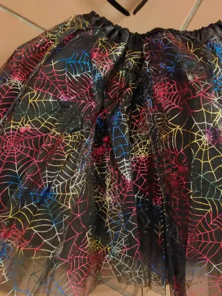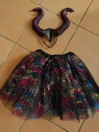 Conjunto de disfraz inspirado en Maléfica, perfecto para fiestas temáticas o Halloween. Incluye diadema con cuernos y falda. - Diadema con cuernos morados y negros. - Falda de tul negra con estampado de telarañas multicolor.