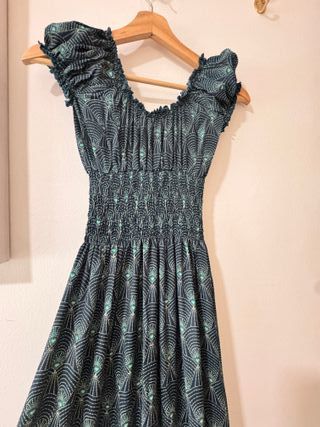 Vestido largo de fiesta, sin estrenar. Presenta un estampado llamativo y un diseño elegante. Color petróleo - Largo hasta los tobillos. - Mangas cortas con volantes. - Cuerpo fruncido con elástico. - Falda con volantes en el bajo.